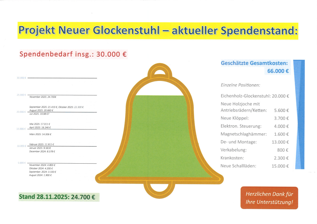 Der Kirchenvorstand hat nach eingehender Abwägung von Alternativen am 16.09.24 entschieden, das nachhaltige Projekt "Neuer Glockenstuhl" anzugehen. Von Landeskirche, Stiftungen und Institutionen sind etwa 35.000,- € in Aussicht gestellt worden. Da die Kirchengemeinde keine Schulden aufnehmen will, sammeln wir solange Spenden, bis die Gesamtkosten nahezu zusammengekommen sind. Möchten Sie uns hierbei unterstützen? Hier sehen Sie den aktuellen Spendenstand: