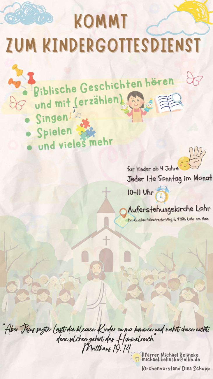 Wir laden alle Kinder ab vier Jahren herzlich zu unserem Kindergottesdienst ein! Wir treffen uns in der Regel immer am ersten Sonntag im Monat - außer in den Schulferien. Wir beginnen jeweils gemeinsam mit den Erwachsenen im Gottesdienst um 10 Uhr in der Auferstehungskirche und gehen dann in unseren eigenen Raum, um dort den Kindergottesdienst zu feiern. Dabei zünden wir unsere Kindergottesdienst-Kerze an, singen fröhliche Lieder, reden mit Gott, hören spannende Geschichten aus der Bibel, basteln tolle Sachen und machen lustige Spiele. Wir hoffen, dass viele Kinder mit ihren Eltern kommen und die Freude am Glauben erleben!